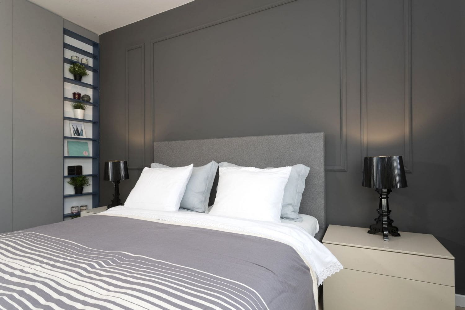 Nevelika spavaonica, koja je po želji vlasnice opremljena u sivim tonovima, ovako je, policom po mjeri od tamnoplavog iverala, oživljena i izgleda znatno zanimljivije. Ovakva polica dobro je rješenje za one koji nemaju mjesta za noćni ormarić.