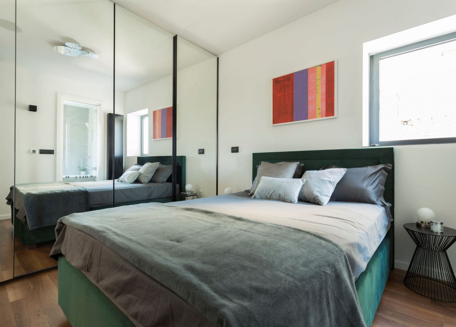 Možete za fronte birati akril materijal koji na površini ima ogledalo, ili, kao u ovom slučaju spavaonice ispod, staviti iveral na klizna vrata na koji će se nalijepiti ogledalo. Prostor izgleda znatno veće, zaigrano i dinamično.