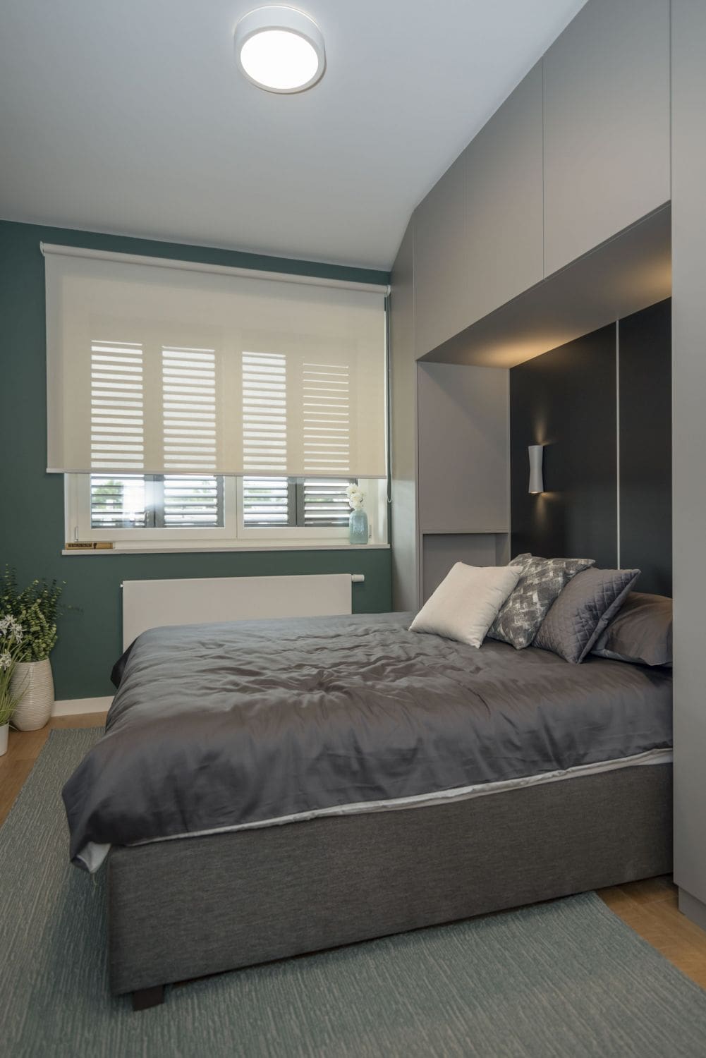 Mostovi se opet vraćaju u spavaće sobe. Ali su sada obogaćeni dodatnim sadržajima odnosno ulogama, što je izvrsno kada su male prostorije u pitanju. Vlasnici su htjeli da prostorija nudi opuštajuću atmosferu, ali i da se osigura dodatno mjesto za spremanje garderobe i posteljine. Napravljen je most od iverala u neutralnoj sivoj nijansi. Manje korišteni odjevni komadi i stvari (skijaška oprema, deke, odjeća izvan sezone…) može pronaći svoje mjesto u gornjim ormarićima, a bočne strane ormarića mogu biti ispunjene stvarima koje češće trebamo. Ili primjerice, to može biti ormar s vješalicama.