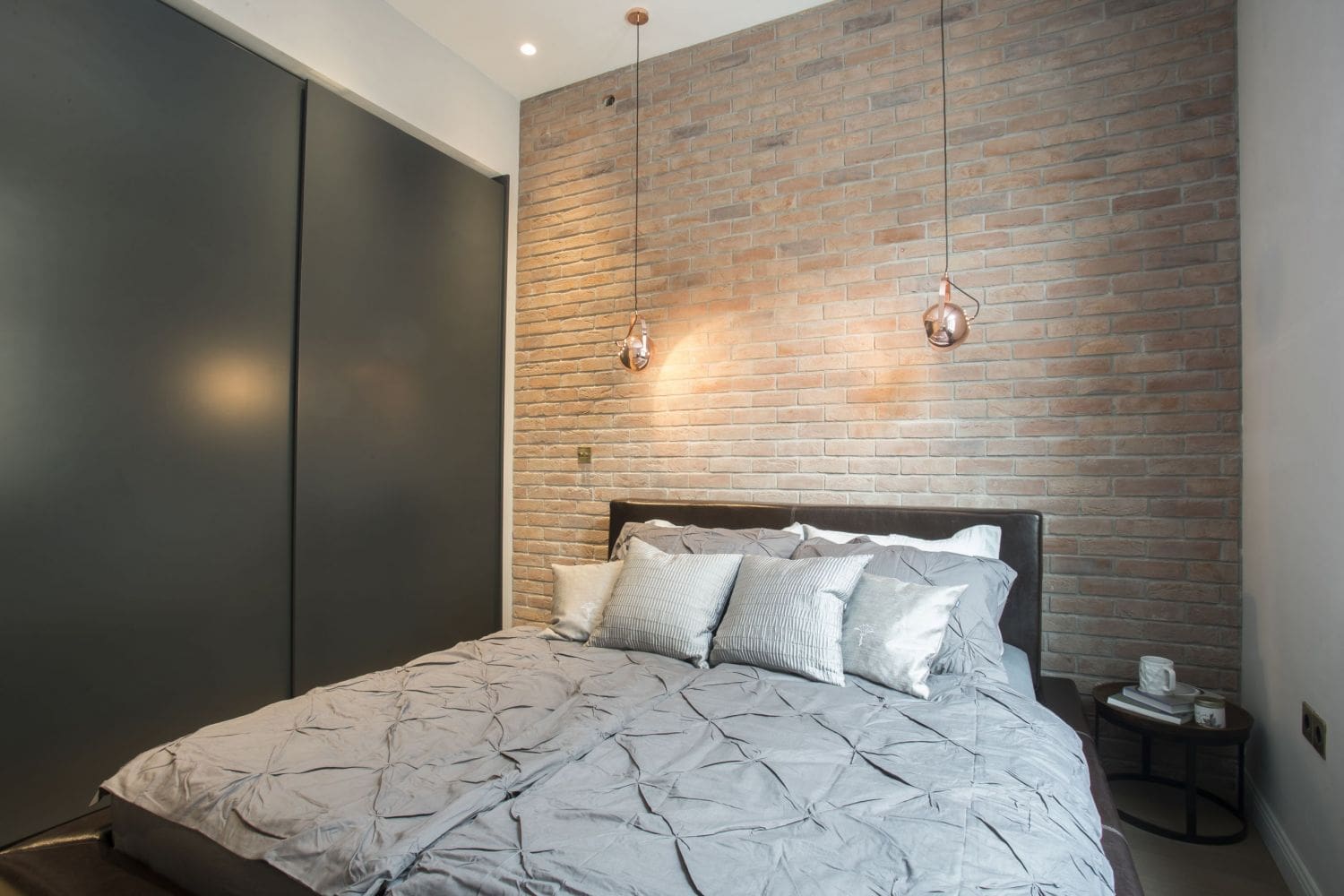 Soba od 10 četvornih metara u starom građanskom stanu u centru Zagreba uređena je, unatoč skučenosti, u tamnijim tonovima i industrijskom stilu. No, zato se inzistiralo samo na nužnim elementima, a budući da je vlasnik samac, bio je potreban samo jedan noćni ormarić, u ovom slučaju stolić. Ostavljen je uski prolaz između kreveta i zida, odnosno kreveta i ormara s druge strane. Ovaj drugi prolaz je širi jer je ipak potrebno više mjesta zbog ormara. No, kako bi se uštedio prostor potreban za otvaranje fronti, napravljena su klizna vrata od lakiranog sivog medijapana, a unutrašnjost odnosno police od drvenog dekora.