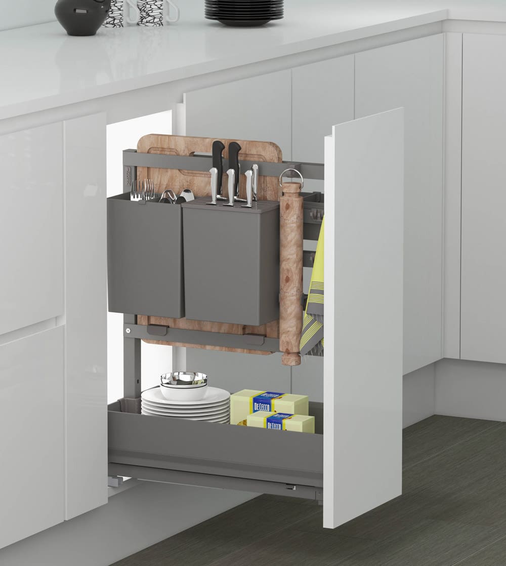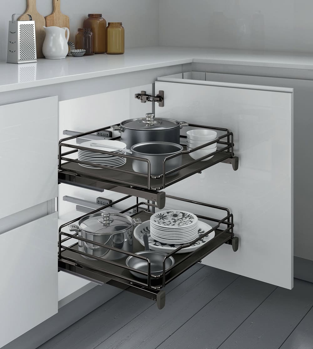 Stručnjaci za razvoj namještaja ustanovili su da uvriježeni koncept zatvorenih ladica i korpusa s policama ima velika ograničenja kad se radi o preglednosti i iskoristivosti volumena. Kao rješenje tog problema usvojen je koncept od više posebnih kontejnera/košara različitih visina i dubine koja odgovara dubini korpusa. Te košare se pozicioniraju jedna iznad druge i posebnim mehanizmom povežu u jedinstveni sustav. Mehanizam se fiksira na frontu i omogućava potpunu izvlaku košara i neometan pristup pohranjenom sadržaju. Košare se izrađuju od žice promjera 5 do 8 mm ili od različitih plastičnih materijala. Taj koncept se pokazao izrazito uspješan i primjenjiv je kako za kuhinjski namještaj, tako i za kupaone te dijelove garderobnih ormara.