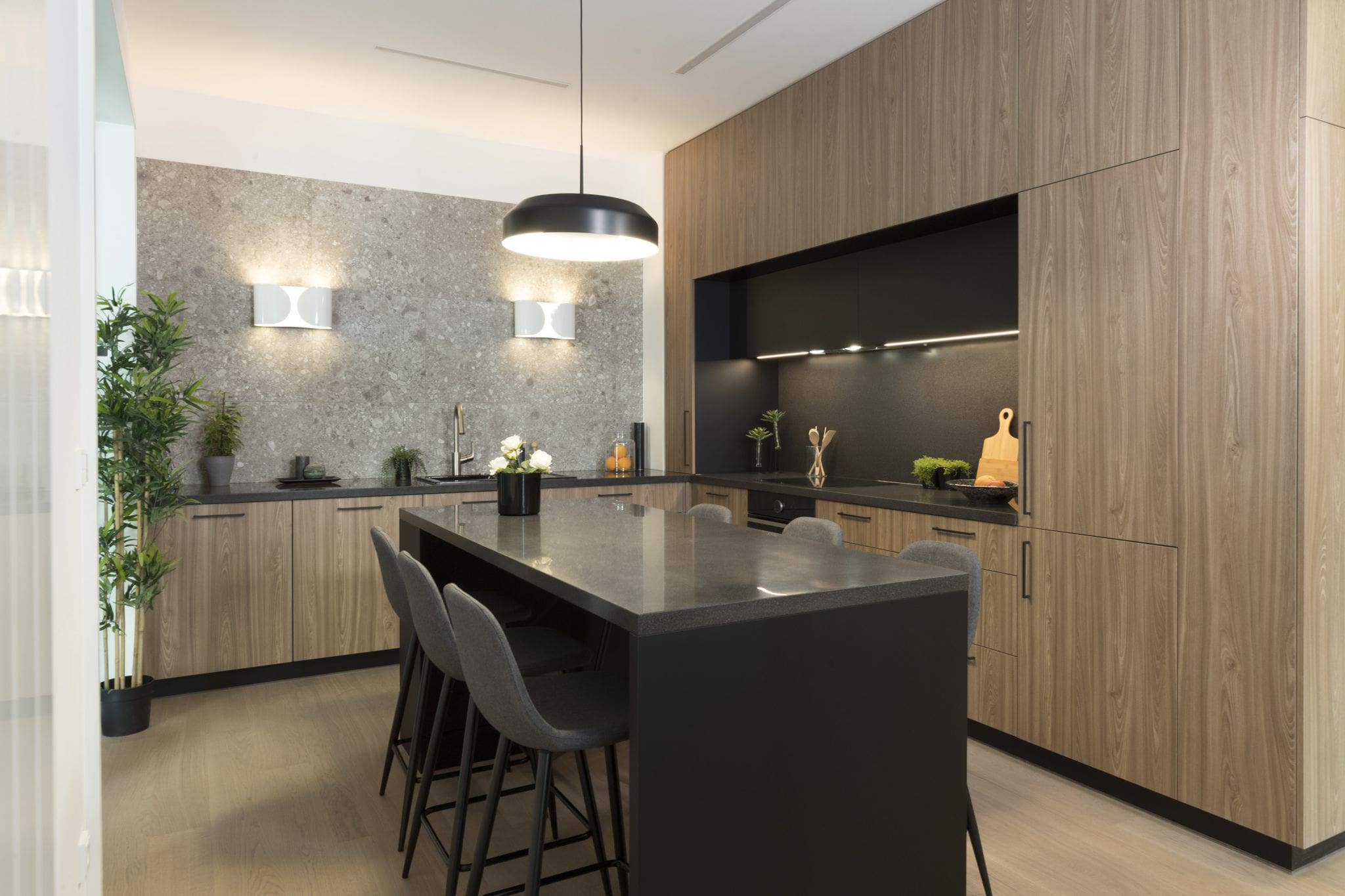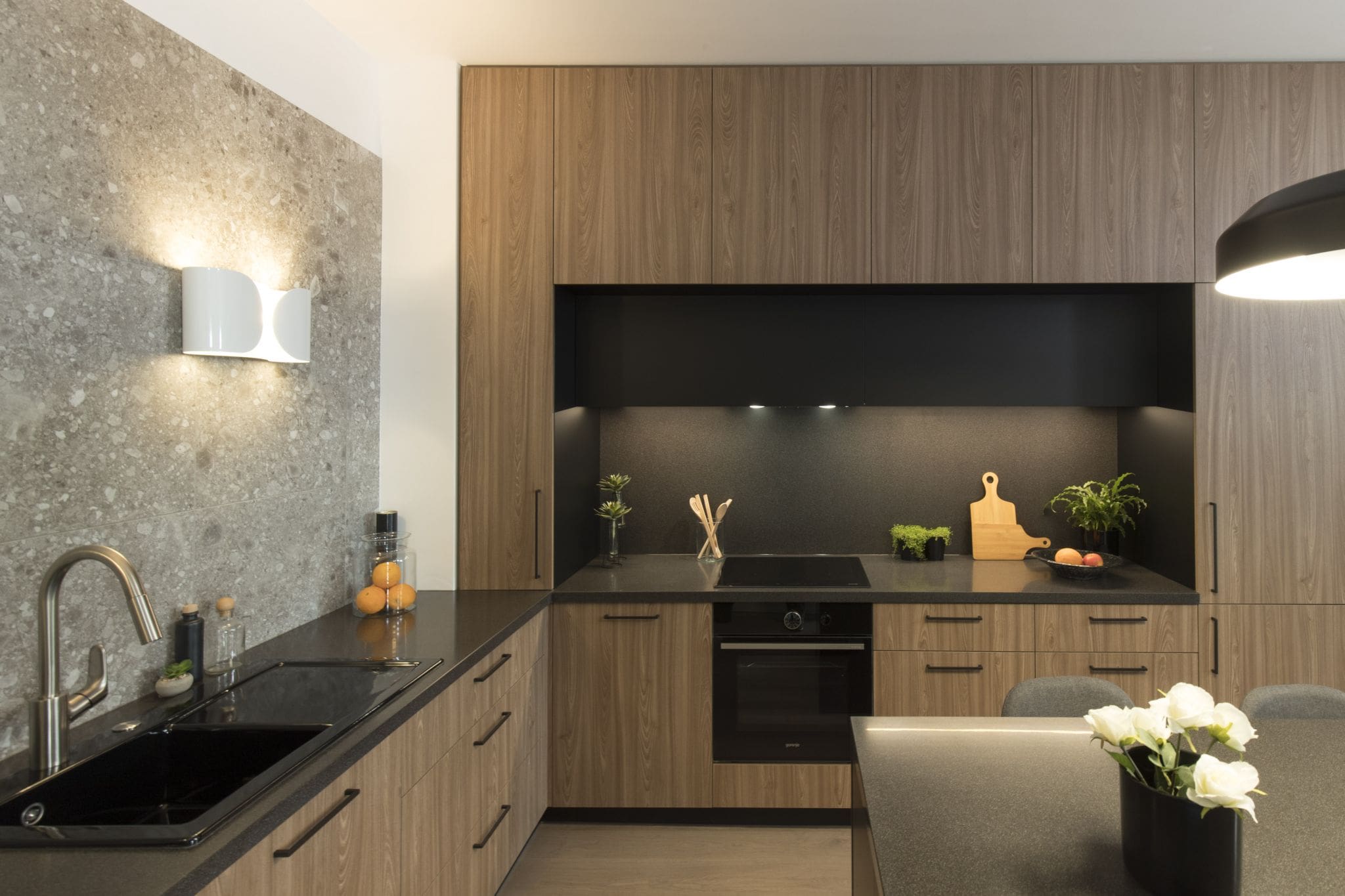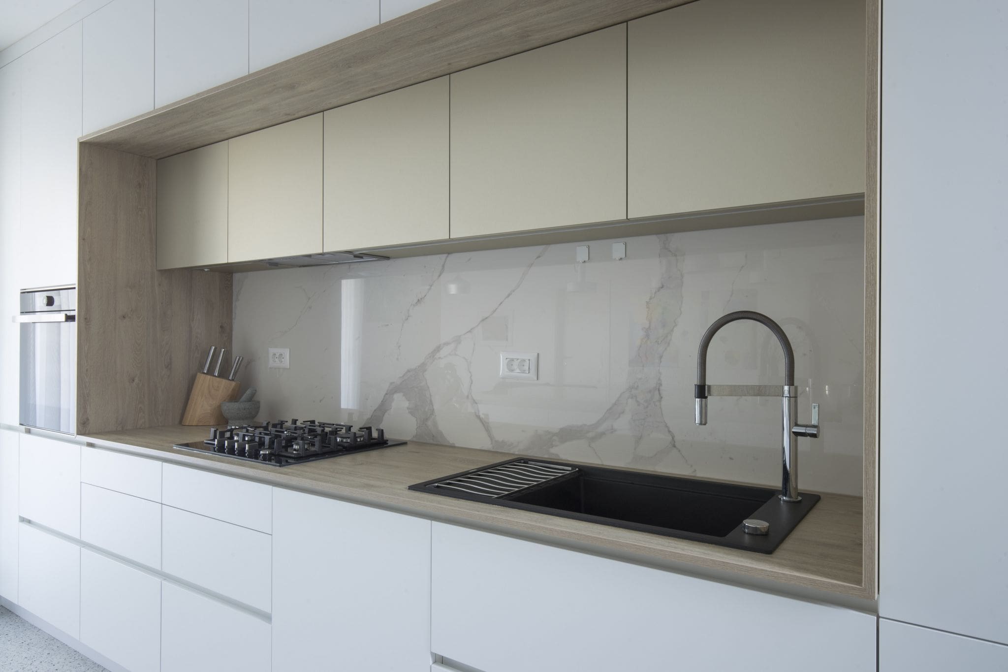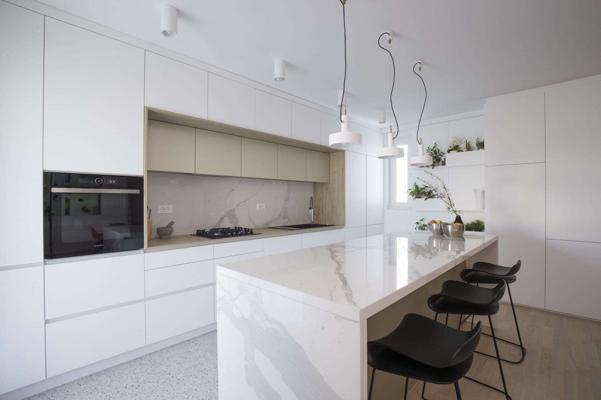 Mat površinama od feniksa, laminata dekora drveta i pet mata, dodan je luksuzni Laminam s uzorkom mramora. Od njega su napravljeni kuhinjski otok kao i zidna obloga u uvučenom dijelu kuhinje.