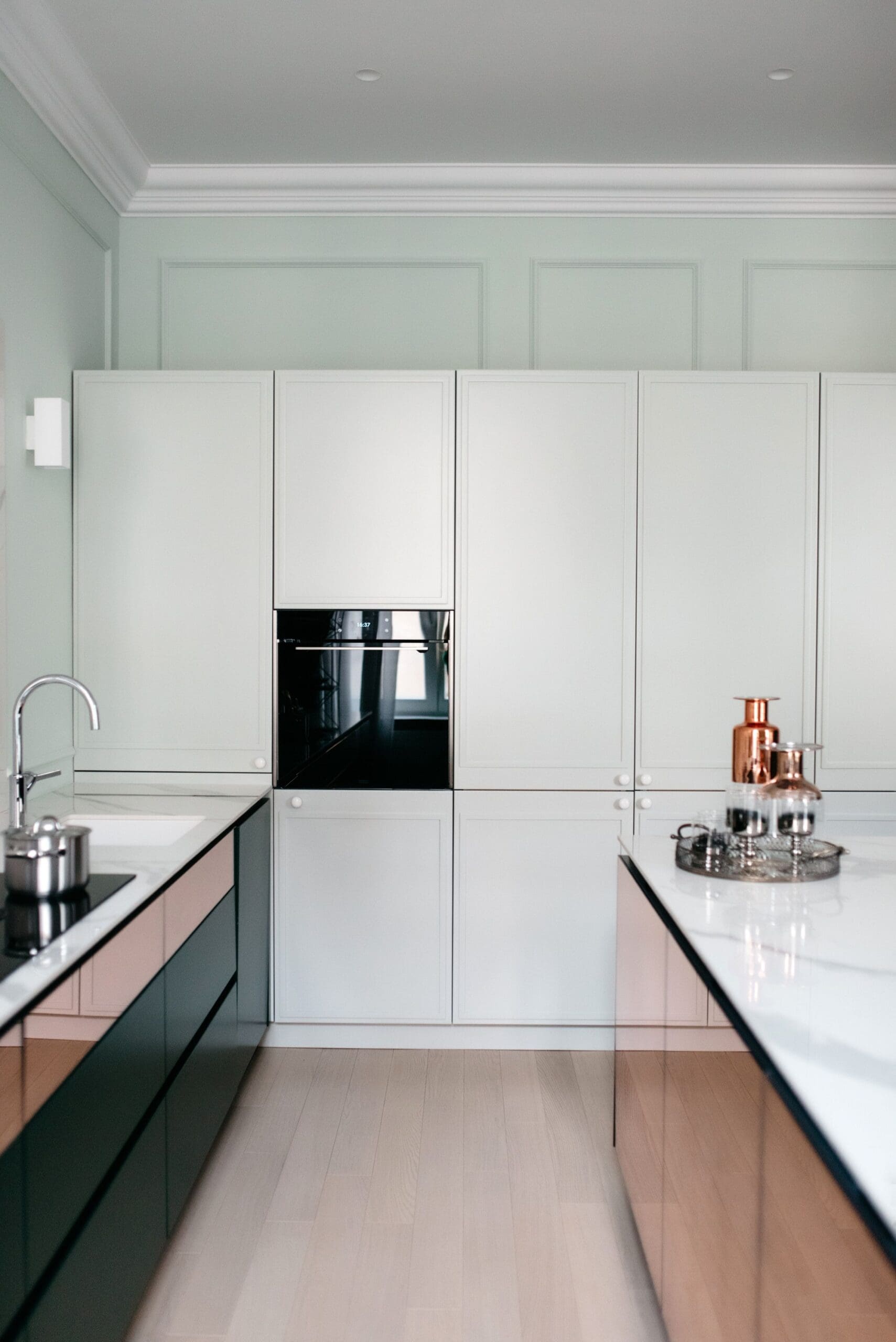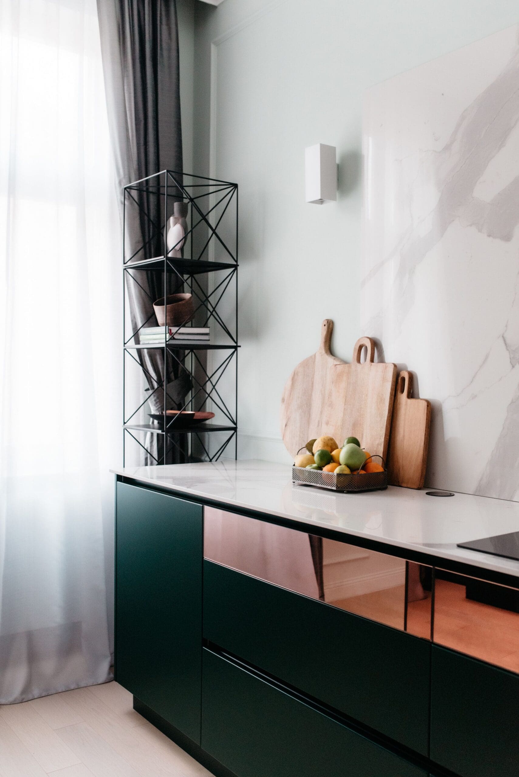 Dodatni element koji daje luksuz je također jedna sjajna površina. Korišteno je ogledalo koje se nalijepilo na fronte od medijapana. Ovakva površina nalazi se i na frontama kuhinjskog šanka. Bakreni odsjaj koje ima staklo dao je šarm klasike te stvorio dinamiku reflektirajući objekte iz okoline.