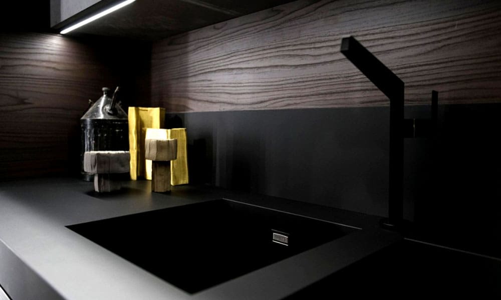 Mat površinama od feniksa, laminata dekora drveta i pet mata, dodan je luksuzni Laminam s uzorkom mramora. Od njega su napravljeni kuhinjski otok kao i zidna obloga u uvučenom dijelu kuhinje.